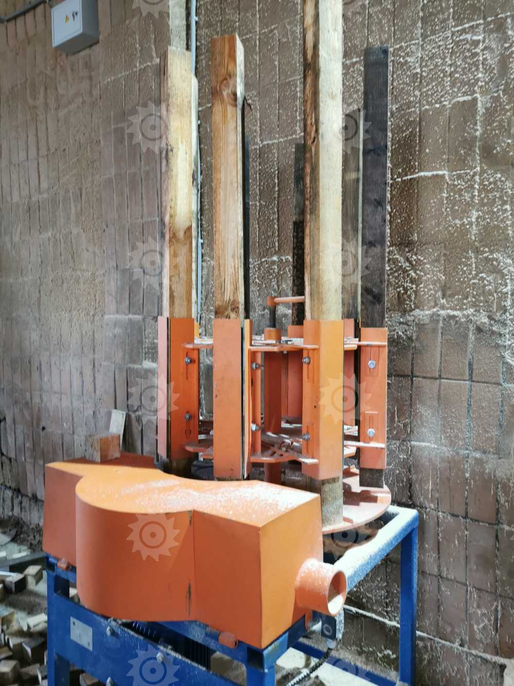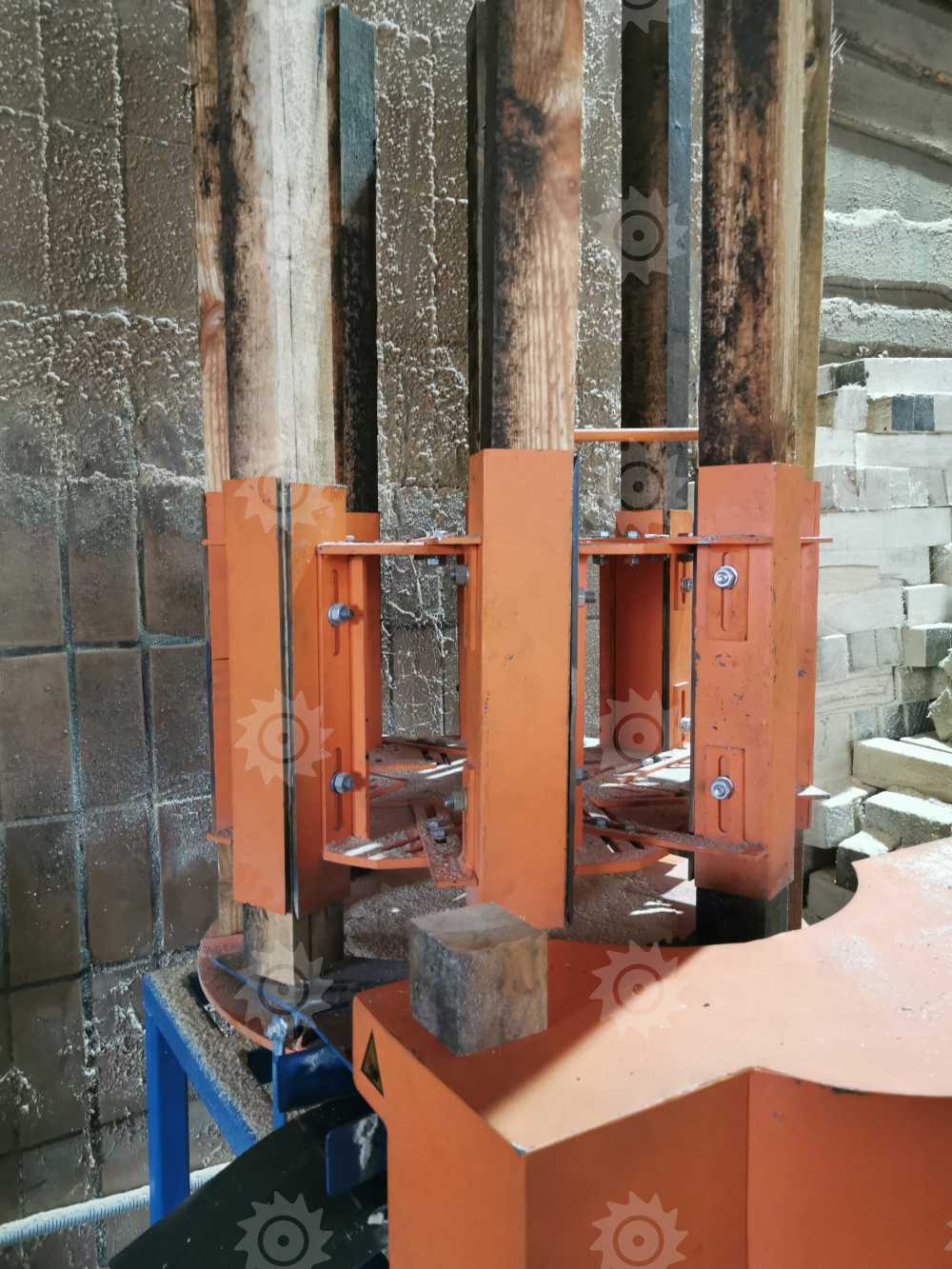 Заготовки установлены вертикально на столе карусельного типа и вращаются вокруг дисковой пилы. Стол карусельного типа имеет регулировку по высоте относительно пилы, за счет этого устанавливается необходимый размер бобышки.